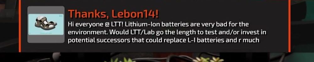 Thanks, Lebon14! Hi everyone @ LTT! Lithium-Ion batteries are very bad for the environment. Would LTT/Lab go the length to test and/or invest in potential successors that could replace L-I batteries and r much