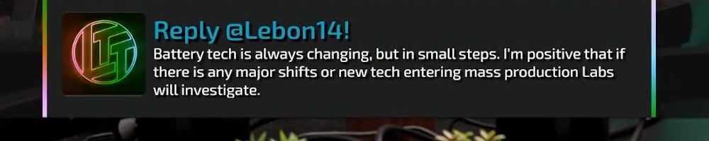 Reply @Lebon14! Battery tech is always changing, but in small steps. I'm positive that if there is any major shifts or new tech entering mass production Labs will investigate.