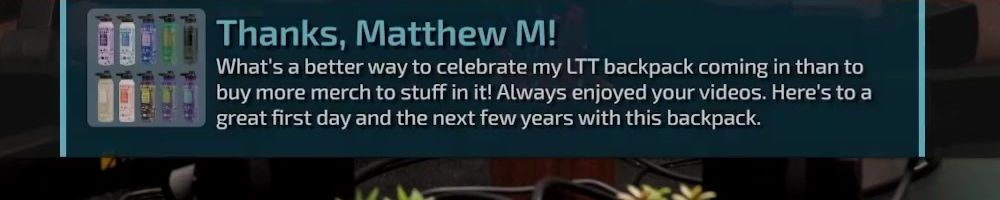 Thanks, Matthew M! What's a better way to celebrate my LTT backpack coming in than to buy more merch to stuff in it! Always enjoyed your videos. Here's to a great first day and the next few years with this backpack.