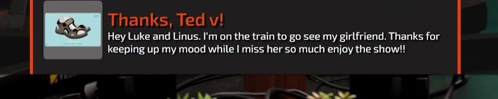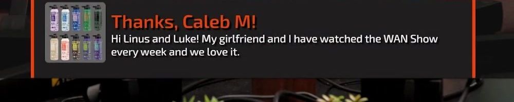 Thanks, Caleb M! Hi Linus and Luke! My girlfriend and I have watched the WAN Show every week and we love it.