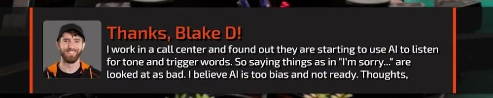 Thanks, Blake D! I work in a call center and found out they are starting to use AI to listen for tone and trigger words. So saying things as in "I'm sorry..." are looked at as bad. I believe AI is too bias and not ready. Thoughts,