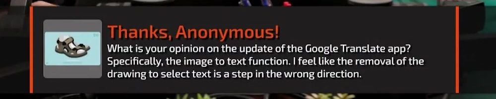 Thanks, Anonymous! What is your opinion on the update of the Google Translate app? Specifically, the image to text function. I feel like the removal of the drawing to select text is a step in the wrong direction.