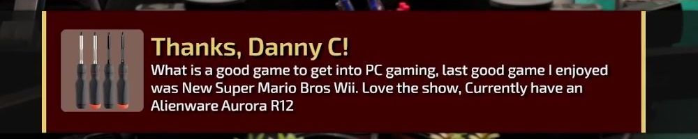 Thanks, Danny C! What is a good game to get into PC gaming, last good game I enjoyed was New Super Mario Bros Wii. Love the show, Currently have an Alienware Aurora R12