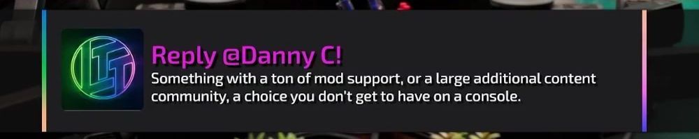 Reply @Danny C! Something with a ton of mod support, or a large additional content community, a choice you don't get to have on a console.