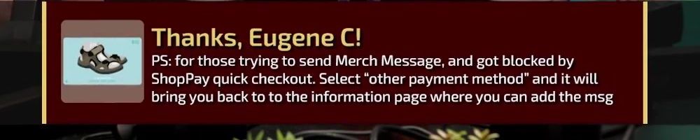 Thanks, Eugene C! PS: for those trying to send Merch Message, and got blocked by ShopPay quick checkout. Select "other payment method" and it will bring you back to to the information page where you can add the msg