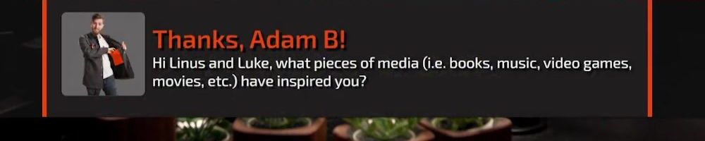 Thanks, Adam B! Hi Linus and Luke, what pieces of media (i.e. books, music, video games, movies, etc.) have inspired you?