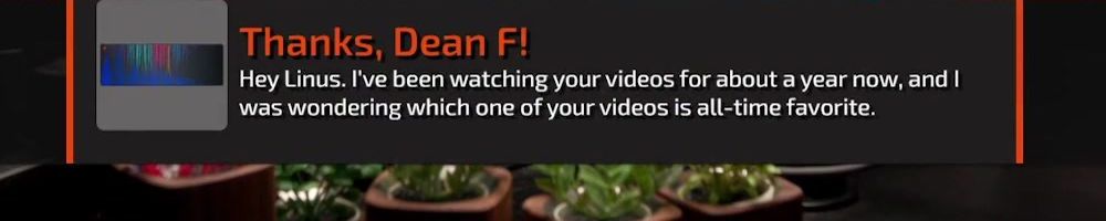 Thanks, Dean F! Hey Linus. I've been watching your videos for about a year now, and I was wondering which one of your videos is all-time favorite.