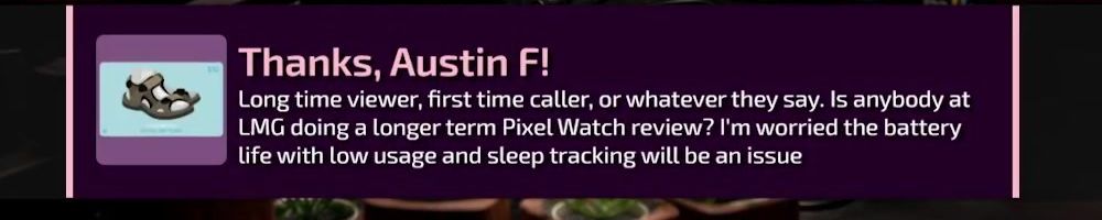 Thanks, Austin F! Long time viewer, first time caller, or whatever they say. Is anybody at LMG doing a longer term Pixel Watch review? I'm worried the battery life with low usage and sleep tracking will be an issue