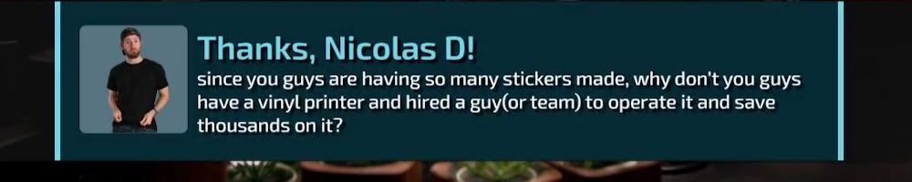 Thanks, Nicolas D! since you guys are having so many stickers made, why don't you guys have a vinyl printer and hired a guy(or team) to operate it and save thousands on it?