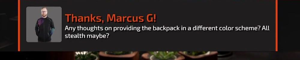 Thanks, Marcus G! Any thoughts on providing the backpack in a different color scheme? All stealth maybe?