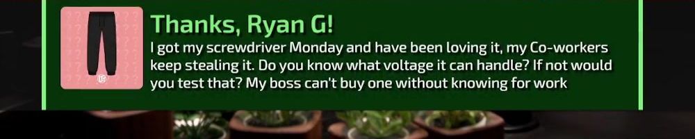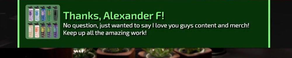 Thanks, Alexander F! No question, just wanted to say I love you guys content and merch! Keep up all the amazing work!