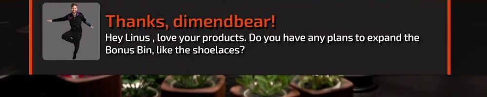 Thanks, dimendbear! Hey Linus, love your products. Do you have any plans to expand the Bonus Bin, like the shoelaces?