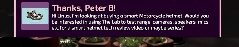 Thanks, Peter B! Hi Linus, I'm looking at buying a smart Motorcycle helmet. Would you be interested in using The Lab to test range, cameras, speakers, mics etc for a smart helmet tech review video or maybe series?
