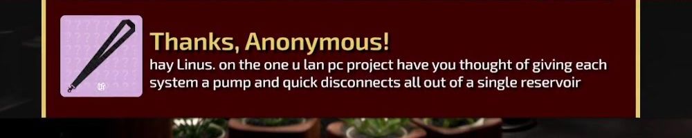 Thanks, Anonymous! hay Linus. on the one u lan pc project have you thought of giving each system a pump and quick disconnects all out of a single reservoir