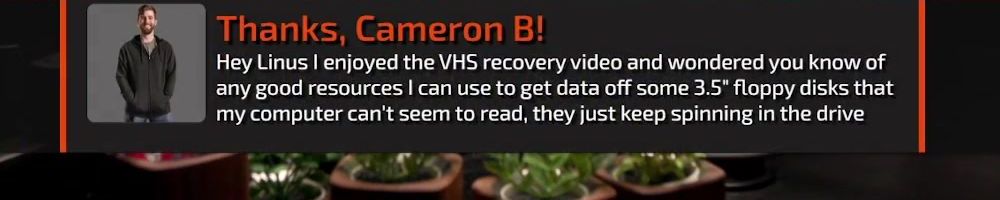 Thanks, Cameron B! Hey Linus I enjoyed the VHS recovery video and wondered you know of any good resources I can use to get data off some 3.5" floppy disks that my computer can't seem to read, they just keep spinning in the drive