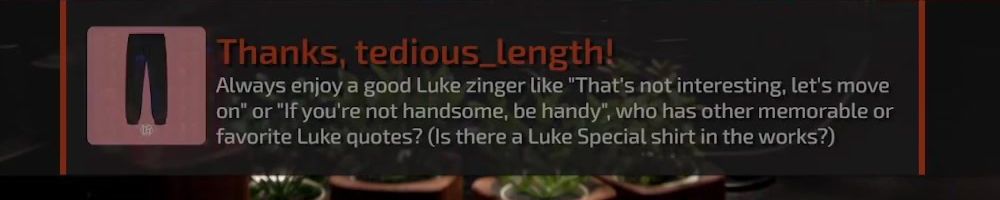 Thanks, tedious_length! Always enjoy a good Luke zinger like “That's not interesting, let's move on" or "If you're not handsome, be handy", who has other memorable or favorite Luke quotes? (Is there a Luke Special shirt in the works?)