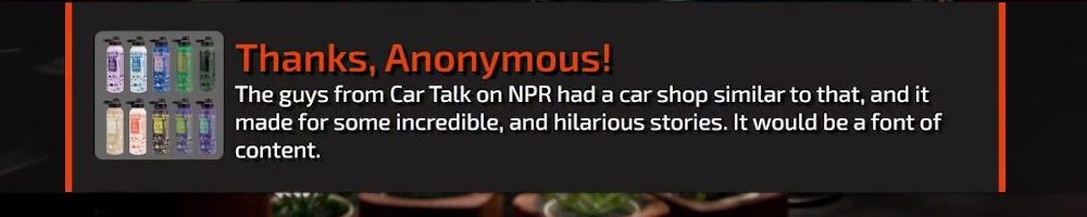 Thanks, Anonymous! The guys from Car Talk on NPR had a car shop similar to that, and it made for some incredible, and hilarious stories. It would be a font of content.