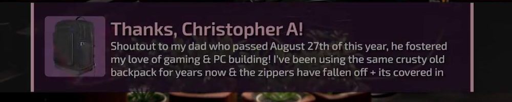 Thanks, Christopher A! Shoutout to my dad who passed August 27th of this year, he fostered my love of gaming & PC building! I've been using the same crusty old backpack for years now & the zippers have fallen off + its covered in