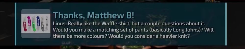 Thanks, Matthew B! Linus, Really like the Waffle shirt, but a couple questions about it. Would you make a matching set of pants (basically Long Johns)? Will there be more colours? Would you consider a heavier knit?