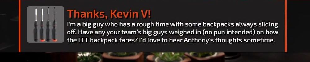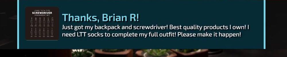 Thanks, Brian R! Just got my backpack and screwdriver! Best quality products I own! I need LTT socks to complete my full outfit! Please make it happen!