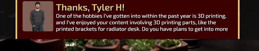 Thanks, Tyler H! One of the hobbies I've gotten into within the past year is 3D printing, and I've enjoyed your content involving 3D printing parts, like the printed brackets for radiator desk. Do you have plans to get into more