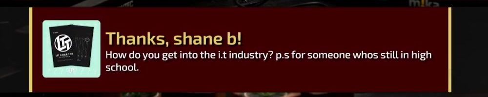 Thanks, shane b! How do you get into the i.t industry? p.s for someone whos still in high school.