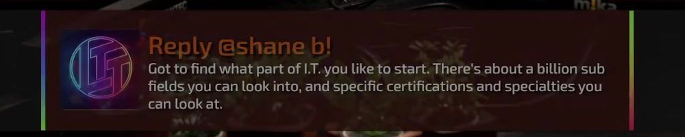Reply @shane b! Got to find what part of I.T. you like to start. There's about a billion sub fields you can look into, and specific certifications and specialties you can look at.