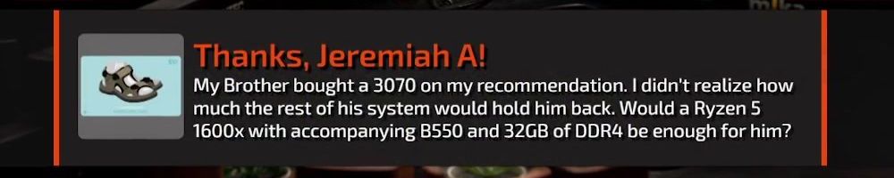 Thanks, Jeremiah A! My Brother bought a 3070 on my recommendation. I didn't realize how much the rest of his system would hold him back. Would a Ryzen 5 1600x with accompanying B550 and 32GB of DDR4 be enough for him?