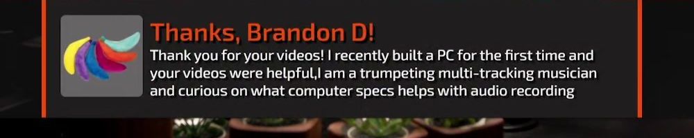 Thanks, Brandon D! Thank you for your videos! I recently built a PC for the first time and your videos were helpful, I am a trumpeting multi-tracking musician and curious on what computer specs helps with audio recording