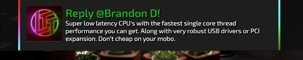 Reply @Brandon D! Super low latency CPU's with the fastest single core thread performance you can get. Along with very robust USB drivers or PCI expansion. Don't cheap on your mobo.