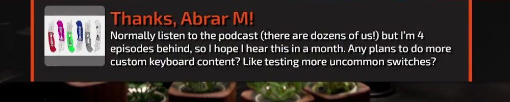 Thanks, Abrar M! Normally listen to the podcast (there are dozens of us!) but I'm 4 episodes behind, so I hope I hear this in a month. Any plans to do more custom keyboard content? Like testing more uncommon switches?
