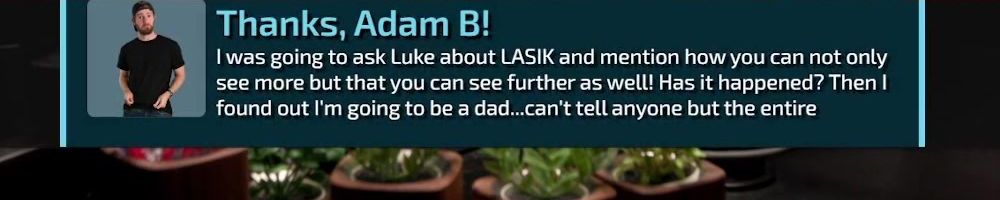 Thanks, Adam B! I was going to ask Luke about LASIK and mention how you can not only see more but that you can see further as well! Has it happened? Then I found out I'm going to be a dad...can't tell anyone but the entire