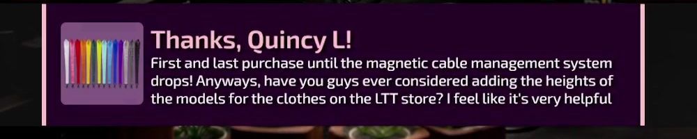 Thanks, Quincy L! First and last purchase until the magnetic cable management system drops! Anyways, have you guys ever considered adding the heights of the models for the clothes on the LTT store? I feel like it's very helpful