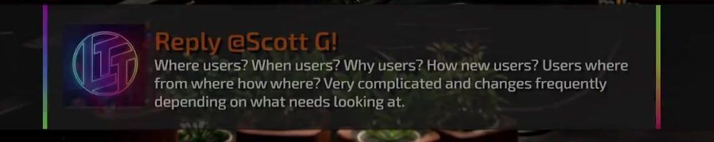 Reply @Scott G! Where users? When users? Why users? How new users? Users where from where how where? Very complicated and changes frequently depending on what needs looking at.