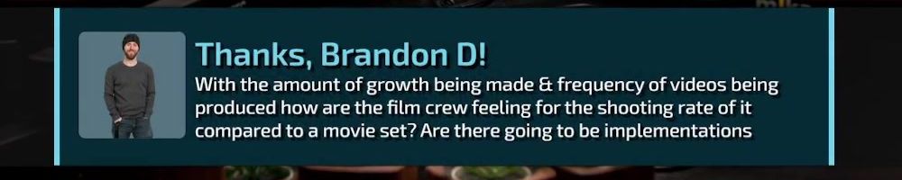 Thanks, Brandon D! With the amount of growth being made & frequency of videos being produced how are the film crew feeling for the shooting rate of it compared to a movie set? Are there going to be implementations