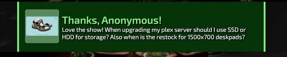 Thanks, Anonymous! Love the show! When upgrading my plex server should I use SSD or HDD for storage? Also when is the restock for 1500x700 deskpads?