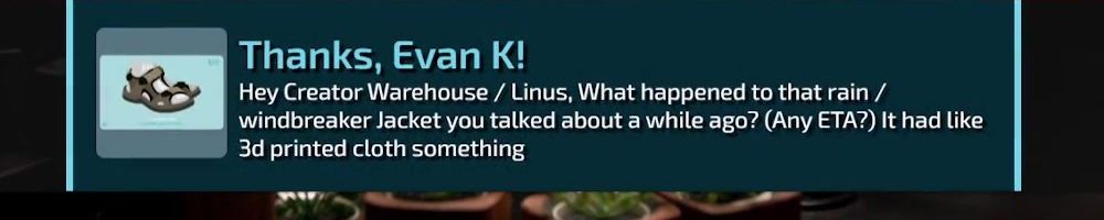 Thanks, Evan K! Hey Creator Warehouse / Linus, What happened to that rain / windbreaker Jacket you talked about a while ago? (Any ETA?) It had like 3d printed cloth something