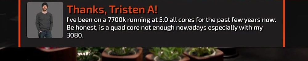 Thanks, Tristen A! I've been on a 7700k running at 5.0 all cores for the past few years now. Be honest, is a quad core not enough nowadays especially with my 3080.