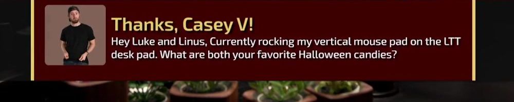 Thanks, Casey V! Hey Luke and Linus, Currently rocking my vertical mouse pad on the LTT desk pad. What are both your favorite Halloween candies?