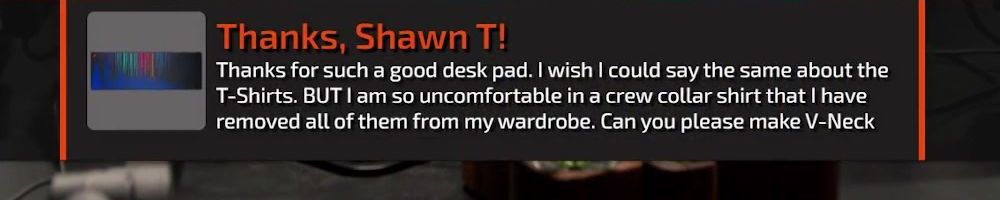 Thanks for such a good desk pad. I wish I could say the same about the T-Shirts. BUT I am so uncomfortable in a crew collar shirt that I have removed all of them from my wardrobe. Can you please make V-Neck