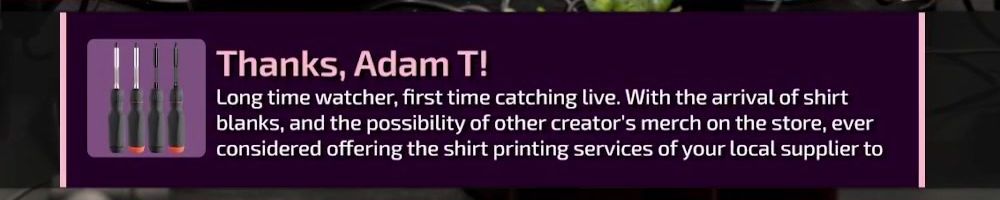 Long time watcher, first time catching live. With the arrival of shirt blanks, and the possibility of other creator's merch on the store, ever considered offering the shirt printing services of your local supplier to
