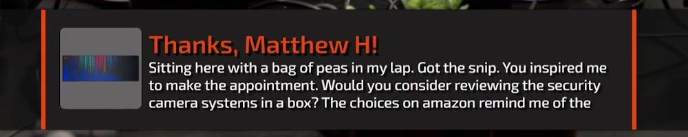 Sitting here with a bag of peas in my lap. Got the snip. You inspired me to make the appointment. Would you consider reviewing the security camera systems in a box? The choices on amazon remind me of the