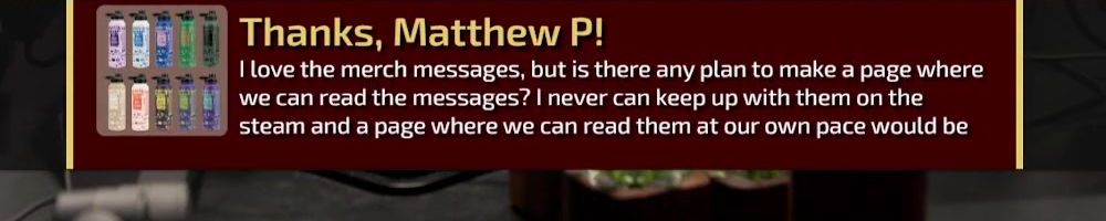 I love the merch messages, but is there any plan to make a page where we can read the messages? I never can keep up with them on the steam and a page where we can read them at our own pace would be
