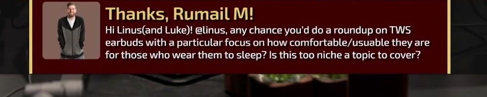 Hi Linus(and Luke)! @linus, any chance you'd do a roundup on TWS earbuds with a particular focus on how comfortable/usuable they are for those who wear them to sleep? Is this too niche a topic to cover?