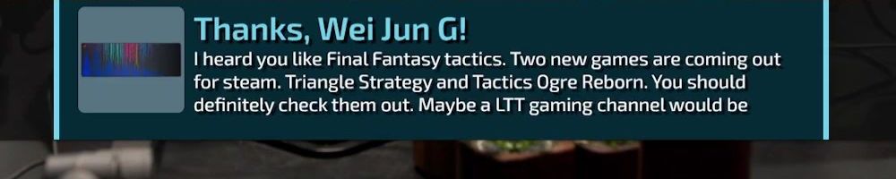 I heard you like Final Fantasy tactics. Two new games are coming out for steam. Triangle Strategy and Tactics Ogre Reborn. You should definitely check them out. Maybe a LTT gaming channel would be