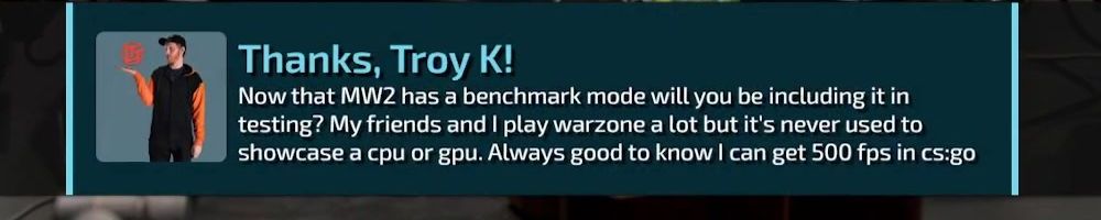 Now that MW2 has a benchmark mode will you be including it in testing? My friends and I play warzone a lot but it's never used to showcase a cpu or gpu. Always good to know I can get 500 fps in cs:go