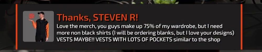 Love the merch, you guys make up 75% of my wardrobe, but I need more non black shirts (I will be ordering blanks, but I love your designs) VESTS MAYBE! VESTS WITH LOTS OF POCKETS similar to the shop