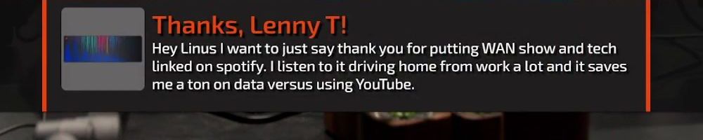 Hey Linus I want to just say thank you for putting WAN show and tech linked on spotify. I listen to it driving home from work a lot and it saves me a ton on data versus using YouTube.