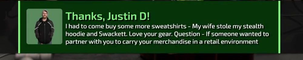 I had to come buy some more sweatshirts - My wife stole my stealth hoodie and Swackett. Love your gear. Question - If someone wanted to partner with you to carry your merchandise in a retail environment
