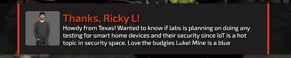 Howdy from Texas! Wanted to know if labs is planning on doing any testing for smart home devices and their security since IoT is a hot topic in security space. Love the budgies Luke! Mine is a blue